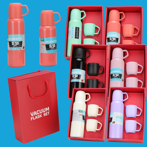 Recién llegado, juego de regalo de acero inoxidable personalizado de 500ml, termo al vacío con 2 tazas